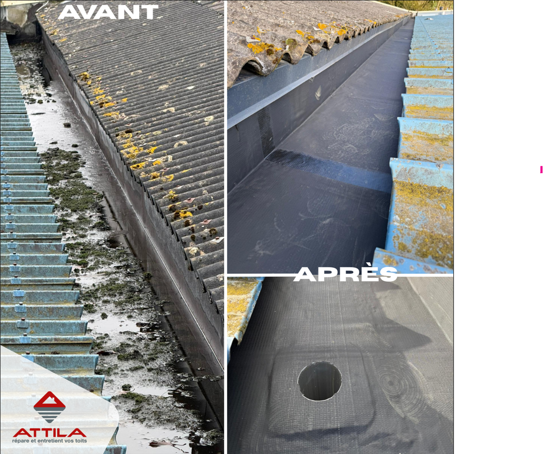 Nos techniciens de toiture ATTILA sont intervenues pour effectuer une réparation ciblée du chéneau fuyant, en utilisant le Resistit, une solution reconnue pour son excellente étanchéité et sa durabilité.