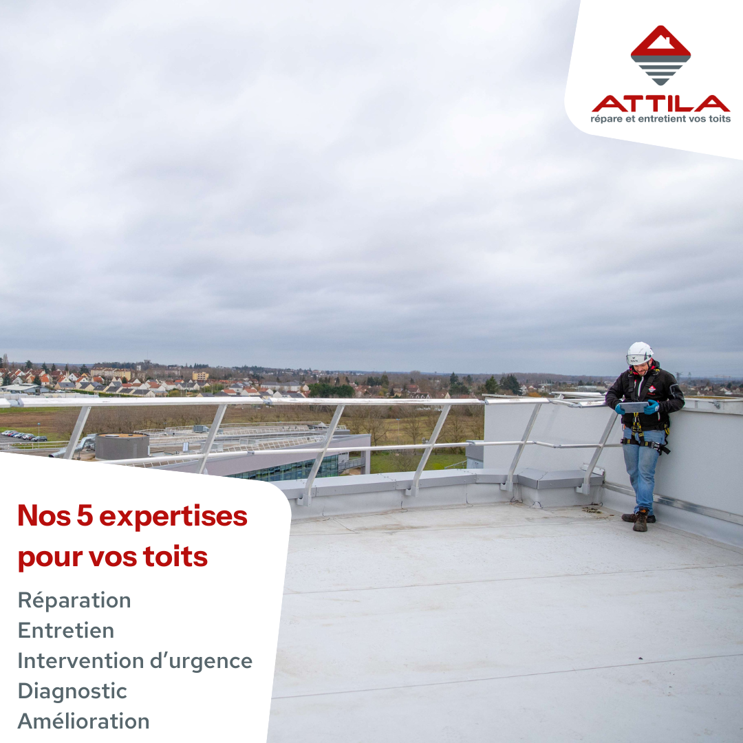 ATTILA est le 1er réseau national spécialisé dans la réparation, l’entretien et la maintenance de tous les types de toits, qu’ils soient industriels, traditionnels, en terrasse ou amiantés.