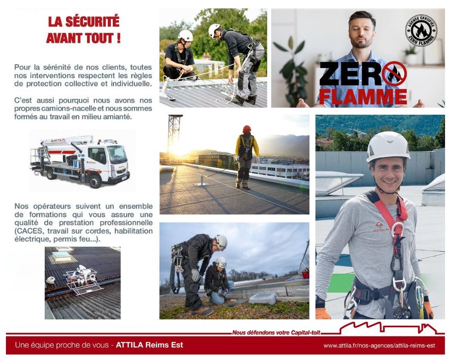 L’agence ATTILA REIMS EST fait de sécurité sa priorité lors des interventions sur vos toits. Tous les moyens techniques et humains sont mis en œuvre, sans limitation de temps ni de coûts, pour assurer la sécurité des personnes et des biens.