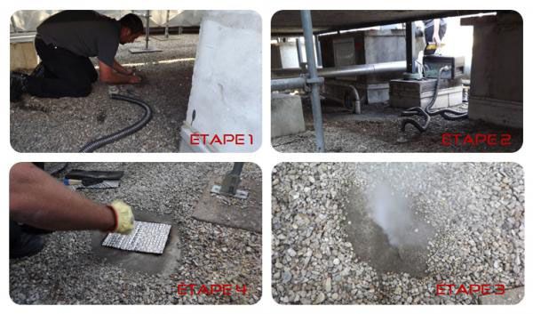 Nous injectons de la fumée sous pression sous le revêtement. Lorsque la fumée s’échappe elle signale une fuite. Une fois repérée, nous appliquons une rustine.