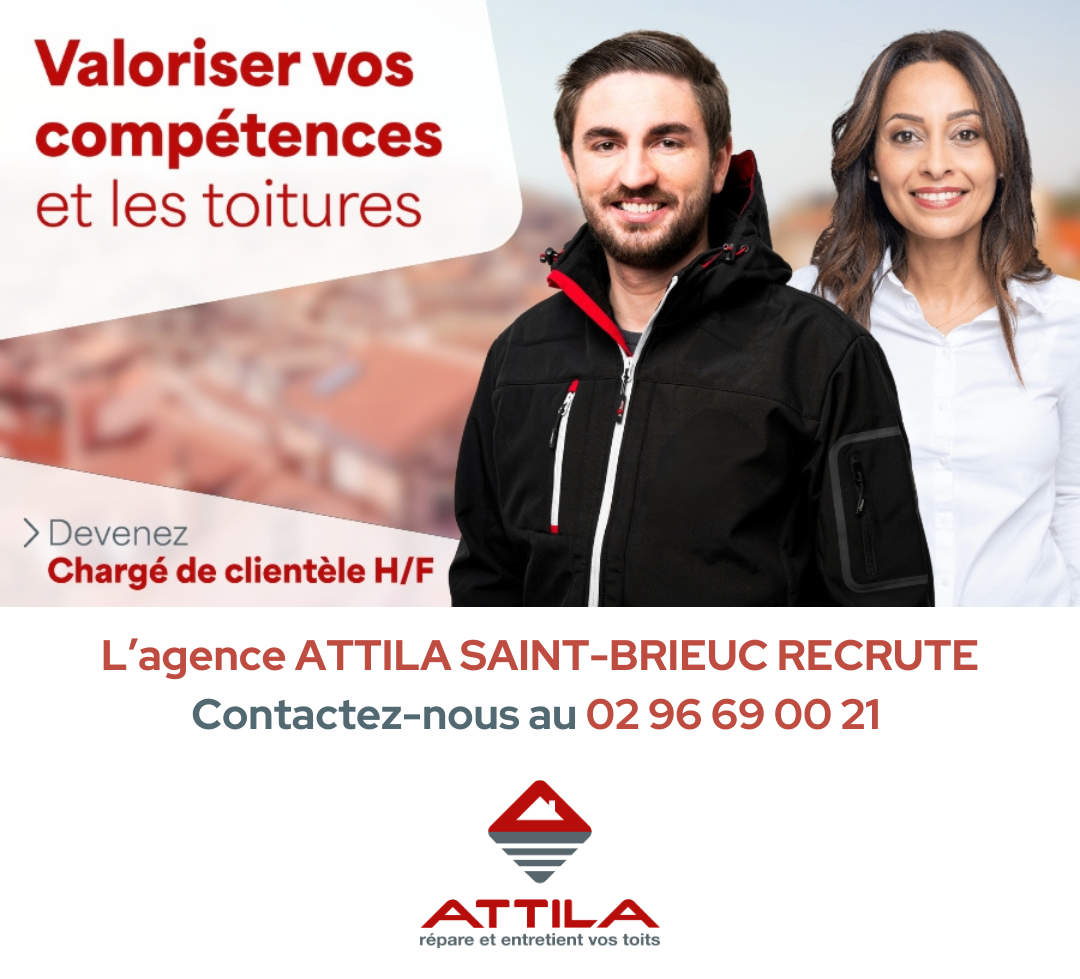 Pour toute information concernant ce recrutement, contactez l’agence ATTILA SAINT BRIEUC au 02 96 69 00 21 ou par mail saintbrieuc@attila.fr