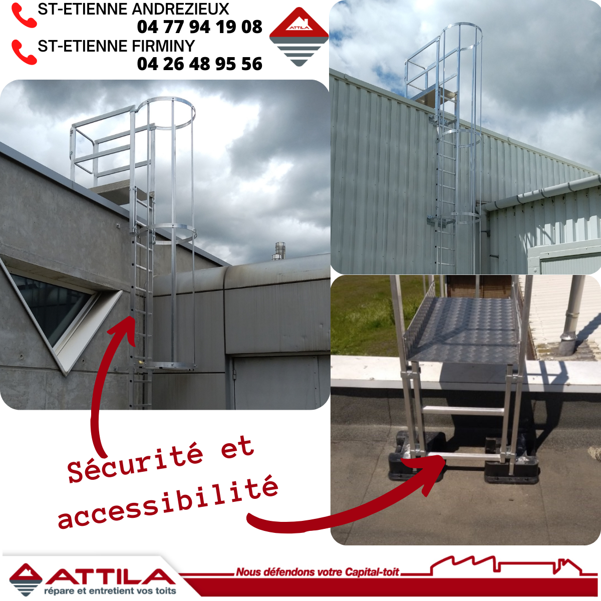 Échelles à crinoline, gardes corps, lignes de vie, potelets d’ancrage, platines, trappes d’accès, … : Attila installe équipements et facilités pour garantir le contrôle de votre toiture pour la protection de votre capital toit.