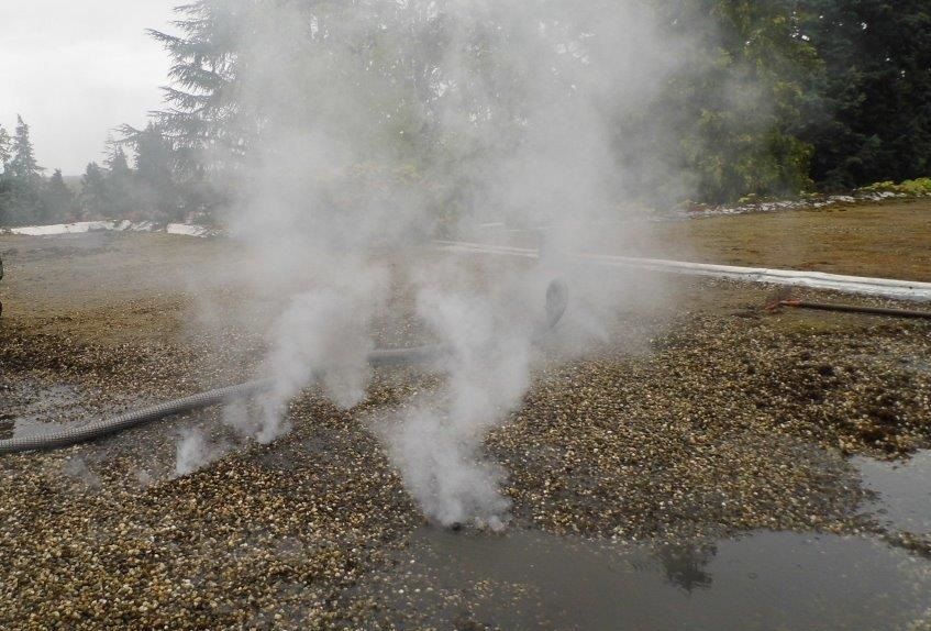 La fumée ressortira par la zone où est située la fuite. Ce procédé permet d’identifier avec exactitude l’origine d’une fuite afin d’effectuer les réparations nécessaires sur la zone concernée. Pour en vérifier l’efficacité un test d’étanchéité est ensuite réalisé en effectuant une mise en eau de l’ancienne zone de fuite.