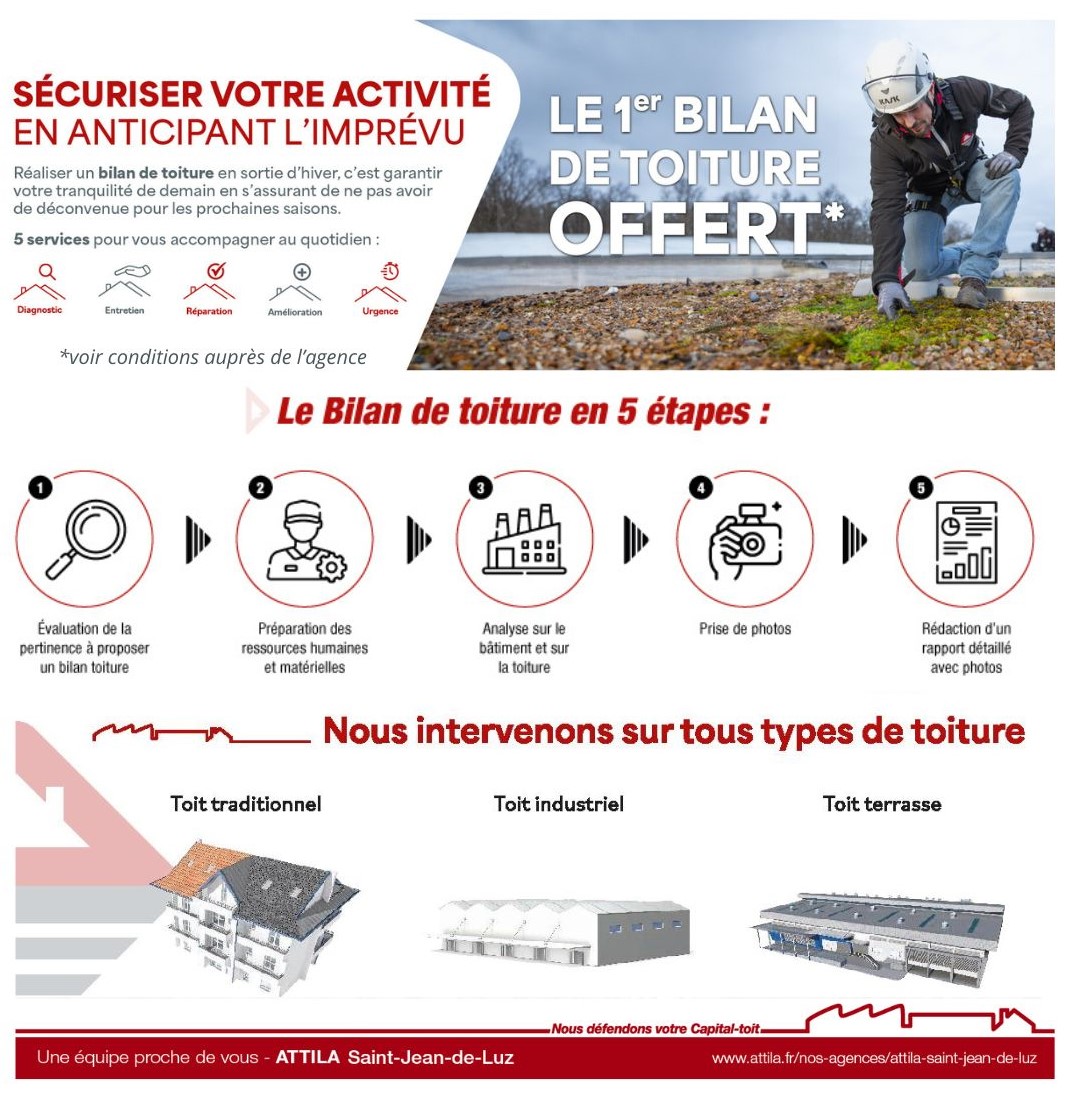 En ce moment, l’agence ATTILA SAINT-JEAN-DE-LUZ vous offre* votre premier bilan de toiture.