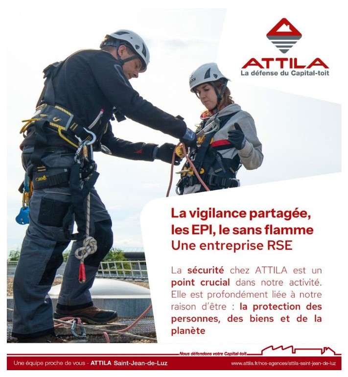 L’agence ATTILA SAINT-JEAN-DE-LUZ, à travers la réparation et l’entretien de toiture plutôt que la réfection, contribue à réduire de façon significative les déchets produits lors de nos interventions. Il en est de même avec les notions essentielles de vigilance partagée, les EPI ou encore le sans flamme.