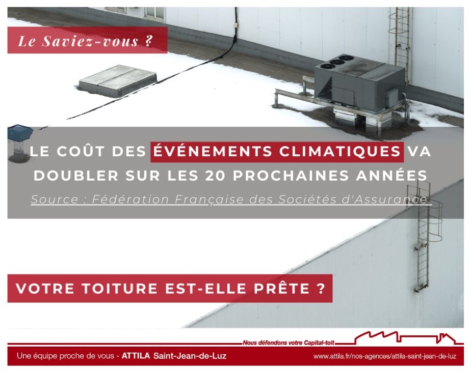 Une étude a été publiée par la Fédération Française des Sociétés d'Assurance (FFSA). Celle-ci montre que le coût des événements climatiques va doubler sur les 20 prochaines années passant ainsi de 34 milliards à 60 milliards d’euros ! Dans ces conditions, il faut être vigilant et éviter les infiltrations en toiture qui peuvent mettre en péril vos équipements, vos stocks, votre bâtiment, et même toute votre activité.