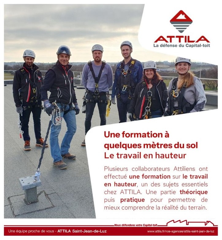 Les Techniciens de Toiture de l’agence ATTILA SAINT-JEAN-DE-LUZ sont chaque jour exposés au risque de chute de hauteur en travaillant sur vos toits à quelques mètres du sol. C’est pourquoi, ils sont sensibilisés en permanence à ces risques, et leur comportement se doit d’être irréprochable à chaque instant. Dans notre agence, nous mettons tout en œuvre, sans limitation de temps ni de coûts, pour assurer la sécurité des personnes et des biens car aucune situation ou urgence ne peut justifier la mise en danger d’autrui. Nous nous impliquons au quotidien dans l’amélioration de la sécurité, la santé, et le bien-être au travail de tous nos collaborateurs.