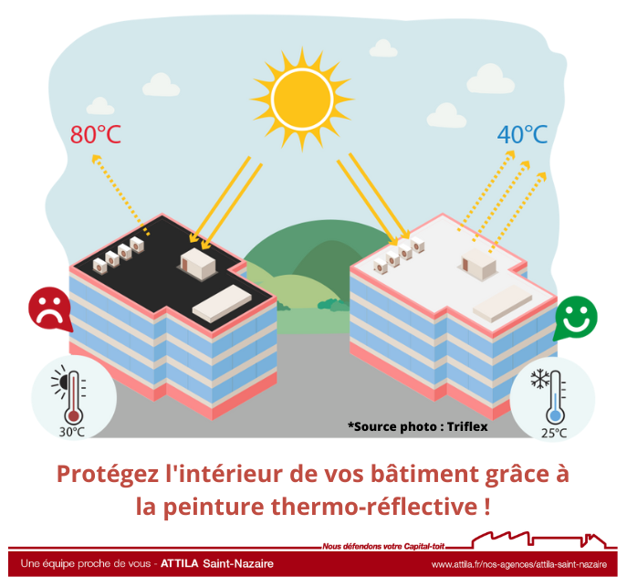 Grâce à ce procédé, vous pourrez réduire fortement l’usage de votre climatisation, et ainsi faire des économies. L’agence ATTILA SAINT-NAZAIRE utilise la solution ProSolar de Triflex qui permet de réduire la chaleur de votre toit en plein été de 80° à 40° et de gagner au moins 5° à l’intérieur.