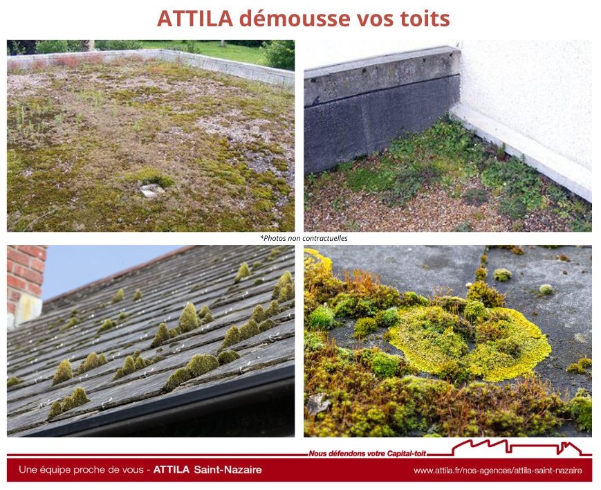 Les mousses et autres indésirables incrustés sur les couvertures prolifèrent, détériorent et provoquent des dommages sur vos toitures. L’agence ATTILA SAINT-NAZAIRE vous en débarrasse en effectuant un démoussage sur votre toiture.