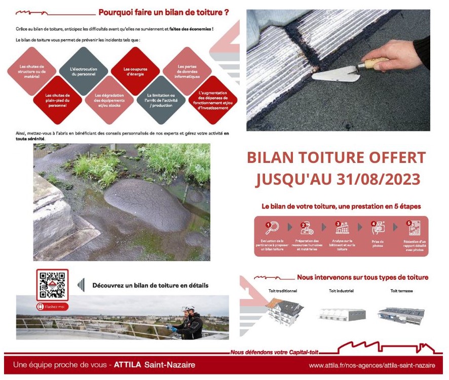 Pour vous accompagner dans cette démarche, l’agence ATTILA SAINT-NAZAIRE vous OFFRE* ce bilan de toiture, sans engagement, jusqu’au 31 août 2023 !
