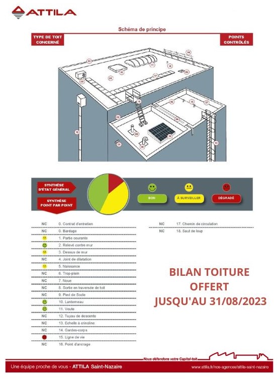 Pour connaitre ce bilan de santé de votre toit, faites appel à ATTILA. Pour vous accompagner dans cette démarche, l’agence ATTILA SAINT-NAZAIRE vous OFFRE* ce bilan de toiture, sans engagement, jusqu’au 31 août 2023 !