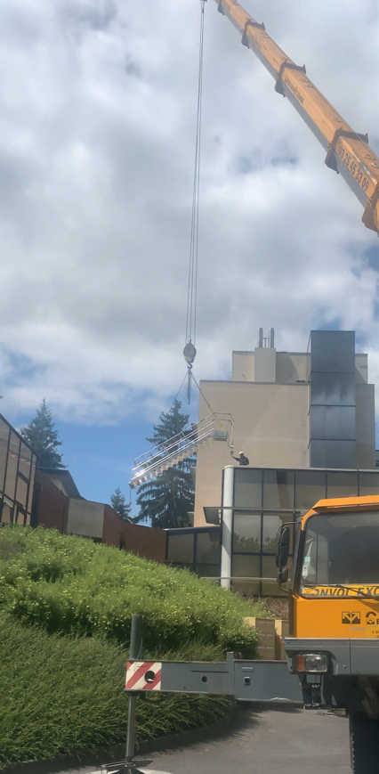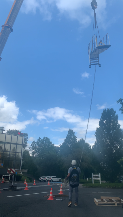 Lorsque nos Techniciens ont été certains que le vent ne poserait aucuns soucis d’ordre technique, ils ont pu élinguer l’escalier et l’accrocher au treuil de la grue pour un acheminement en toiture, en toute sécurité.