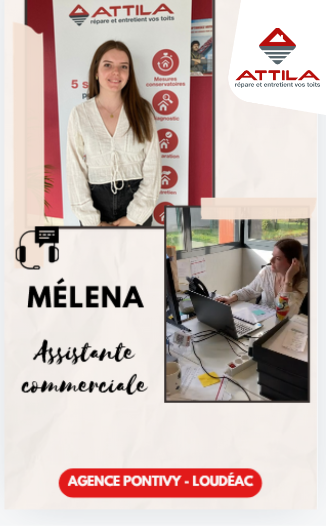 L’agence ATTILA Pontivy/Loudéac a le plaisir d’accueillir au sein de ses équipes Mélena notre nouvelle assistante commerciale, une jeune femme pleine d’énergie, de compétences précieuses pour le développement de notre entreprise et dont les valeurs personnelles résonnent parfaitement avec celles de l’agence.