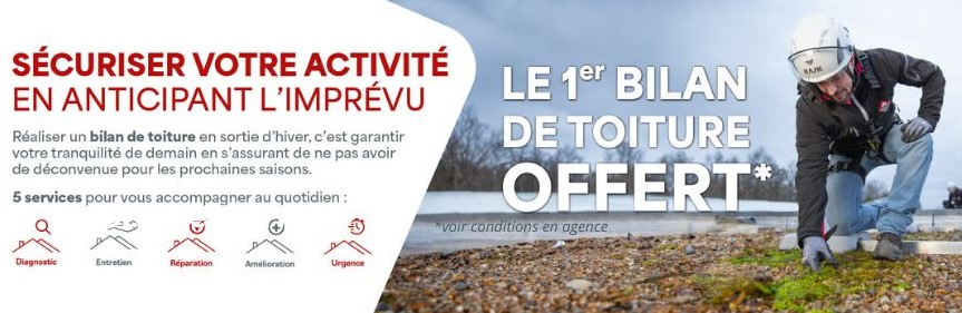 *Bilan toiture offert : offre réservée aux nouveaux clients professionnels valable jusqu’au 30 juin 2024, pour des toits accessibles, sécurisés, sans utilisation de nacelle, et non amiantés, dans la limite de 500 m².
