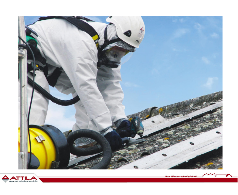 Les techniciens de toiture ATTILA doivent porter une combinaison de protection jetable à capuche de type 5, et un masque de protection respiratoire adapté en niveau de protection P3. Sur les plaques ondulées fibrociment contenant de l’amiante, nous intervenons dans le cadre de travaux d’entretien, nettoyage et de réparation. Nous utilisons les chemins de circulation pour nous déplacer sur ces matériaux fragiles sans les endommager.