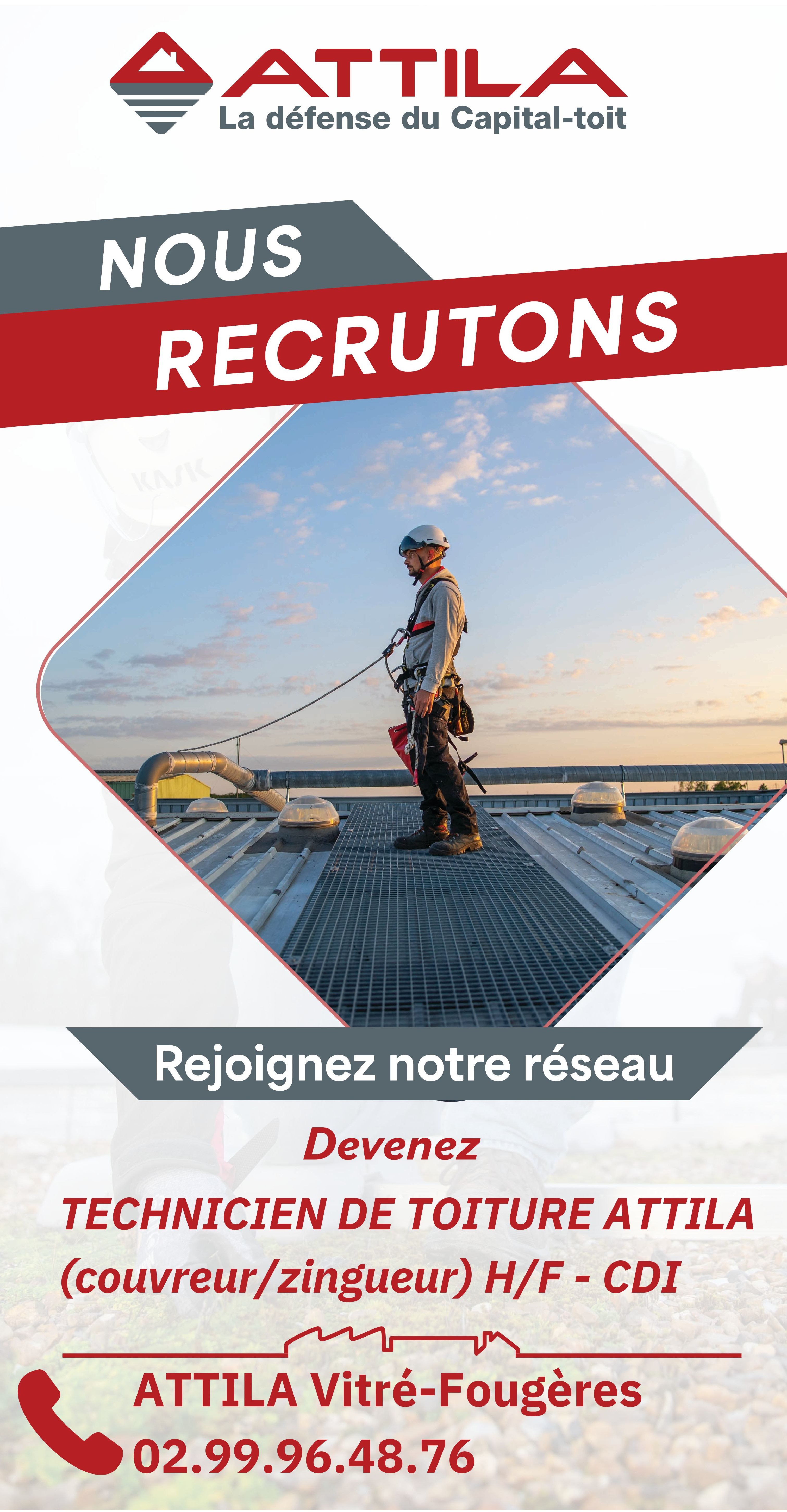 En rejoignant les équipes déjà en place de l’agence ATTILA Vitré-Fougères, vous entrez alors dans un parcours métier spécifique, et nous vous accompagnons dans votre prise de poste et votre évolution tout au long de votre carrière. Chaque jour dans vos missions en extérieur, vous travaillez en équipe, et mettez en œuvre votre technicité grâce à des interventions variées en apportant des solutions aux problématiques en toiture de vos clients. Vous faites évoluer votre carrière vers un métier innovant dans le monde de la couverture, et participez au développement d’une entreprise en vous y impliquant, en apprenant, en vous formant, en développant vos compétences et en partageant vos expériences.