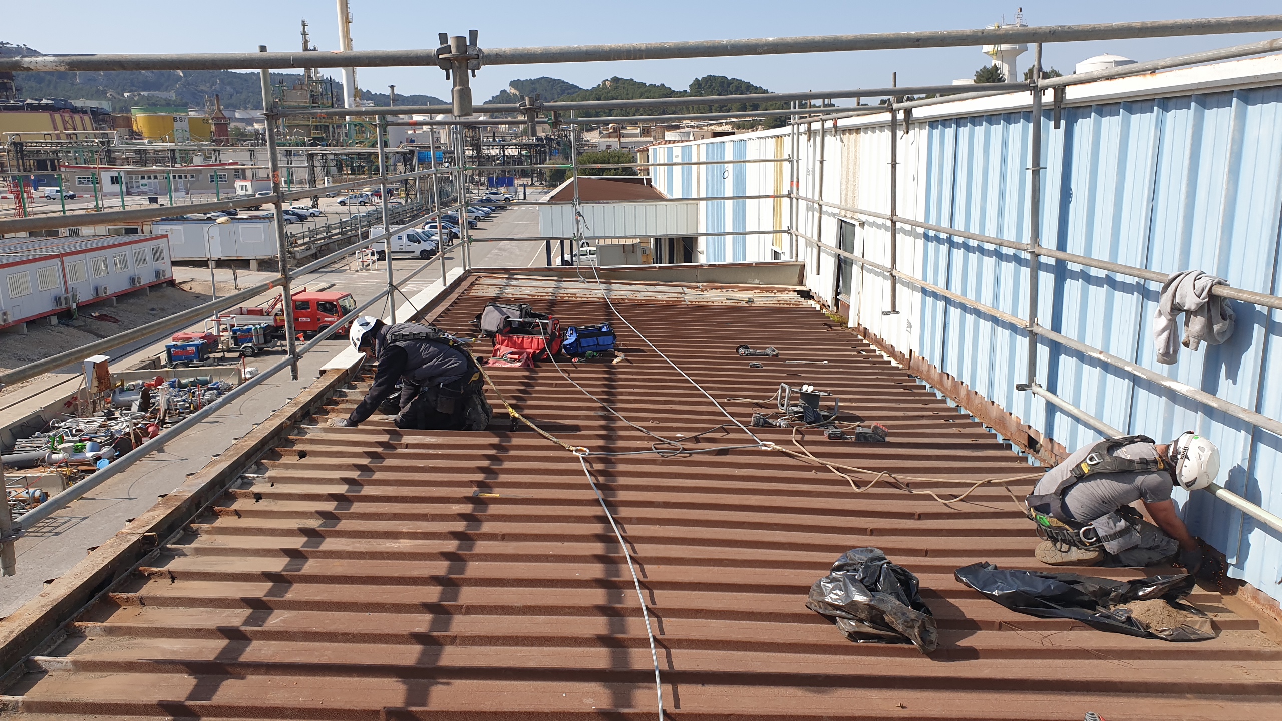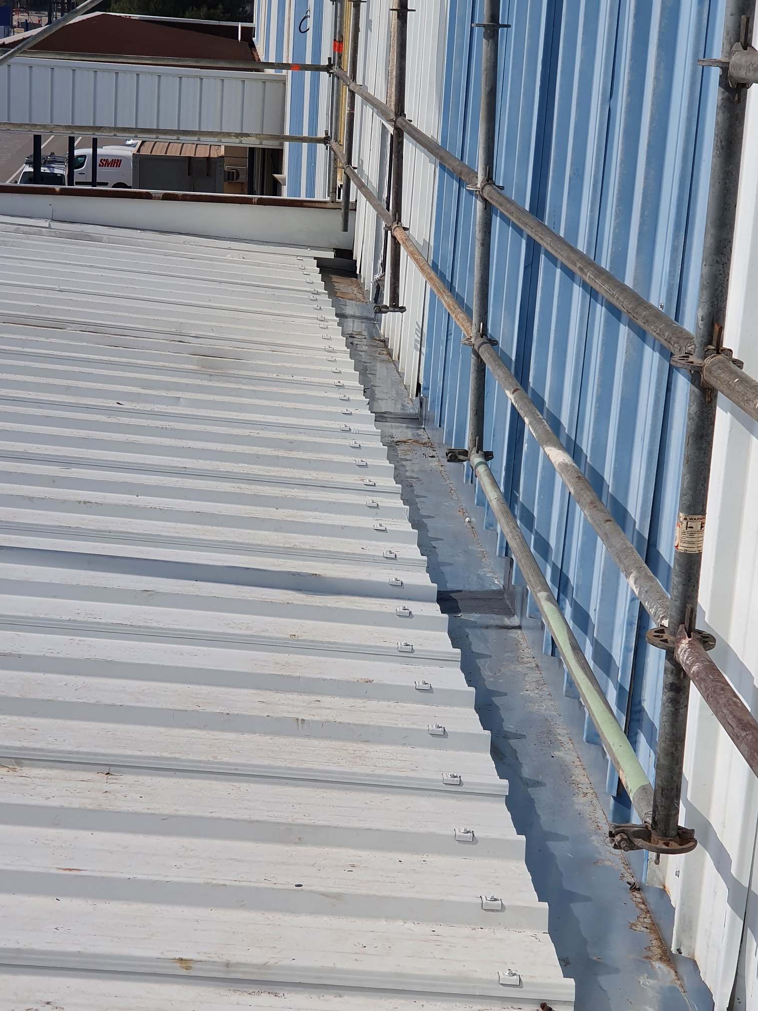 Remplacement des tôles nervurées et d’un chéneau sur un auvent en milieu industriel.