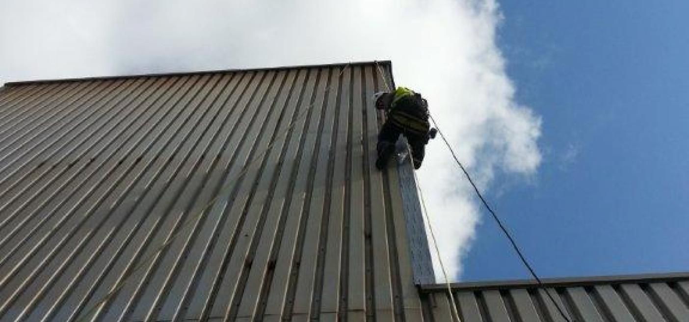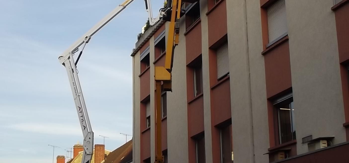 Les couvreurs sont équipés et formés au travail sur corde pour pourvoir intervenir sur des toitures inaccessibles, même là où la nacelle ne peut pas accéder.