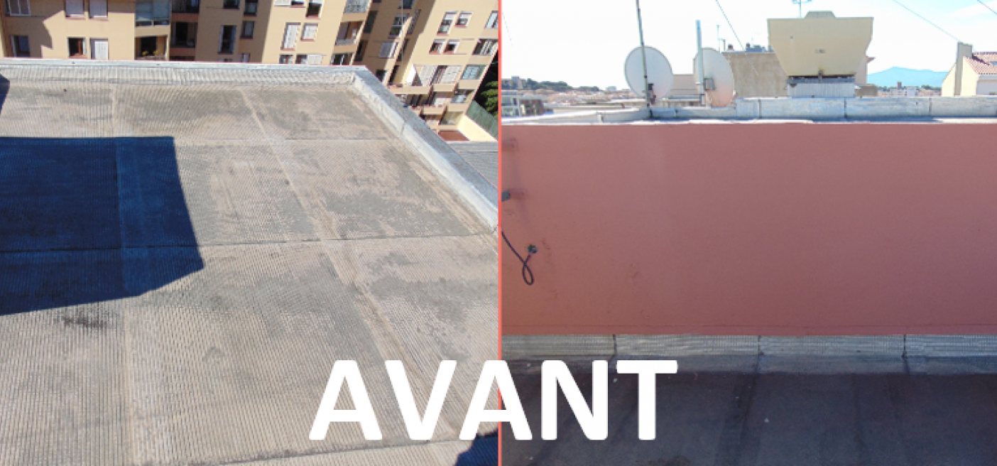 Enlèvement de la protection lourde gravillon mélangée à de la terre et mousse. Réparation de l'étanchéité et changement des EP, caniveaux et lanterneau.