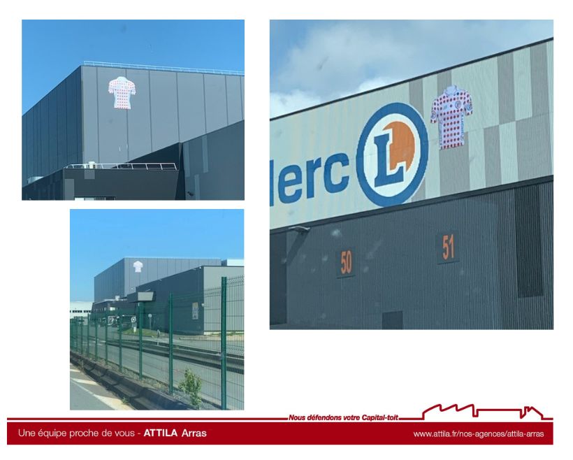 Le bardage de toiture fait partie des prestations ATTILA surtout lorsqu’il se situe le long d’un toit terrasse comme sur ce bâtiment situé à Tilloy lès Mofflaines où ont eu lieu les interventions de l’agence ATTILA ARRAS sur le bardage (société d’approvisionnement des magasins LECLERC, partenaire majeur et sponsor du maillot du meilleur grimpeur).
