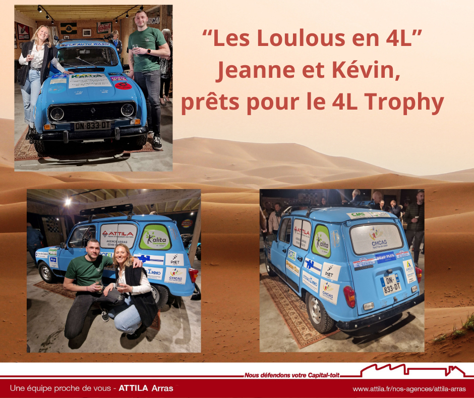 Jeanne et Kévin, 25 et 28 ans, ont créé l’Association caritative Arrageoise « Les Loulous en 4L » pour collecter un budget de participation afin de réaliser le 4L Trophy et ainsi apporter des dons matériels et financiers à des associations humanitaires telles que « Les Enfants du Désert », « La Croix Rouge française » ou encore « Cap Eco Solidaire ».
