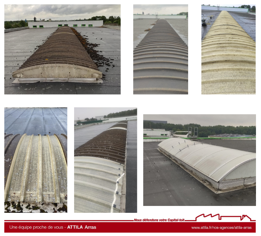 Les Techniciens de Toiture de l’Agence ATTILA ARRAS effectuent toutes les réparations ainsi que le remplacement si nécessaire, comme lors de cette intervention de nettoyage et de remplacement de plaques translucides sur cette toiture industrielle.