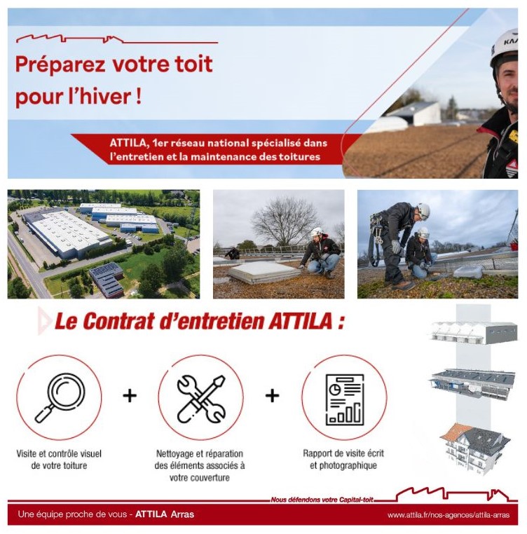 L’agence ATTILA ARRAS est une entreprise spécialisée dans la maintenance de toiture qui vous propose un contrat annuel d’entretien, une solution globale pour vos toits.