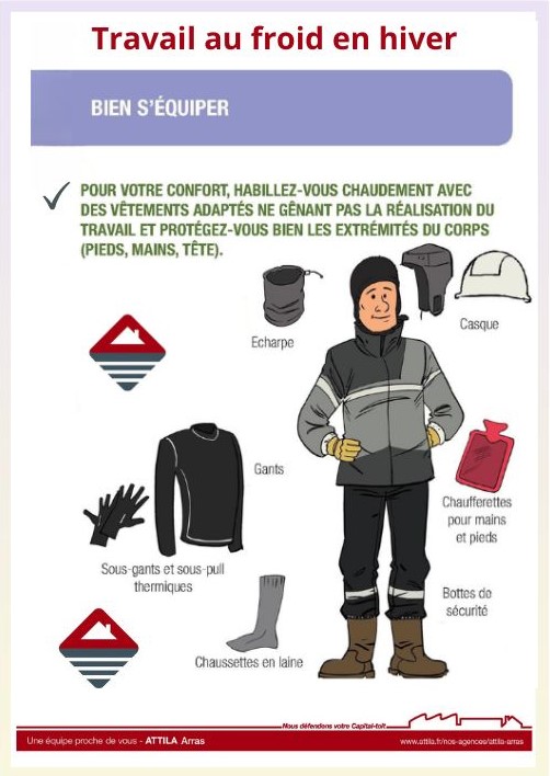 La mise à disposition des Techniciens de Toiture ATTILA de vêtements et équipements individuels contre le froid et les intempéries : Un casque avec doublure isolante, une écharpe tube, des gants isolants et imperméables, des chaufferettes pour mains et pieds, des bottes de sécurité fourrées et antidérapantes, des chaussettes en laine, des sous-gants et sous-pull thermiques.