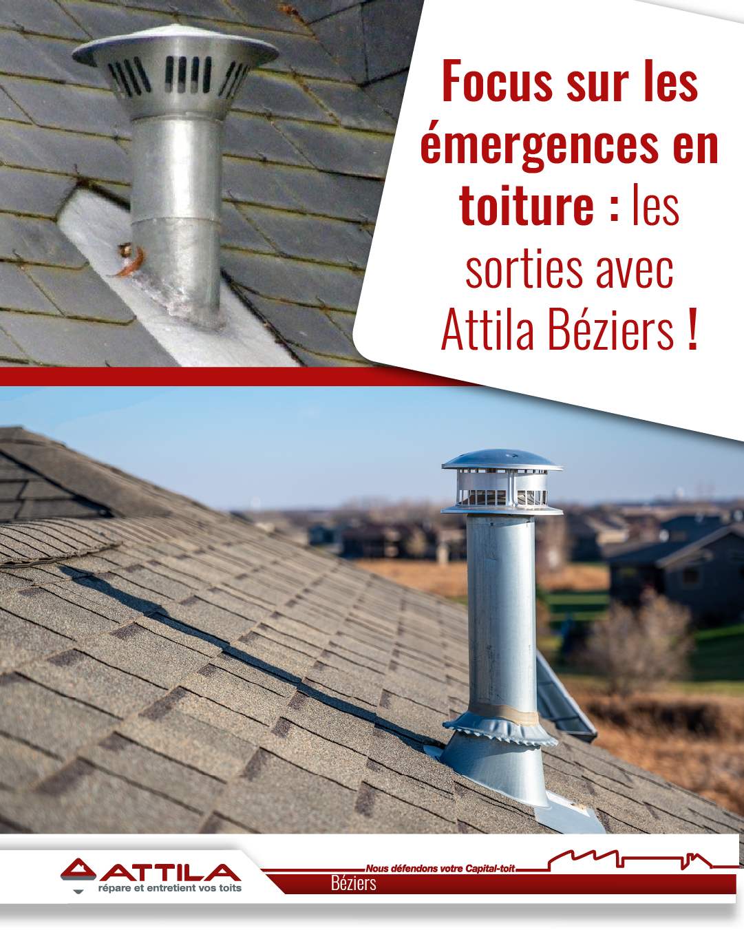 Chez ATTILA Béziers nous effectuons la pose, la réparation, l’entretien et la réfection des émergences en toiture. Nous distinguons deux grands types d’émergence : abergements de cheminée et les sorties de toiture (chatières d’aération, sortie VMC, …).