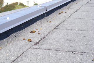 Les feuilles et autres éléments problématiques doivent être enlevés régulièrement pour éviter toute stagnation de l’eau. Sur ce type de toit, il faut impérativement éviter une montée en charge de l’eau qui pourrait engendrer de gros dégâts des eaux, voire un effondrement de la toiture selon l'élément porteur (bac acier).