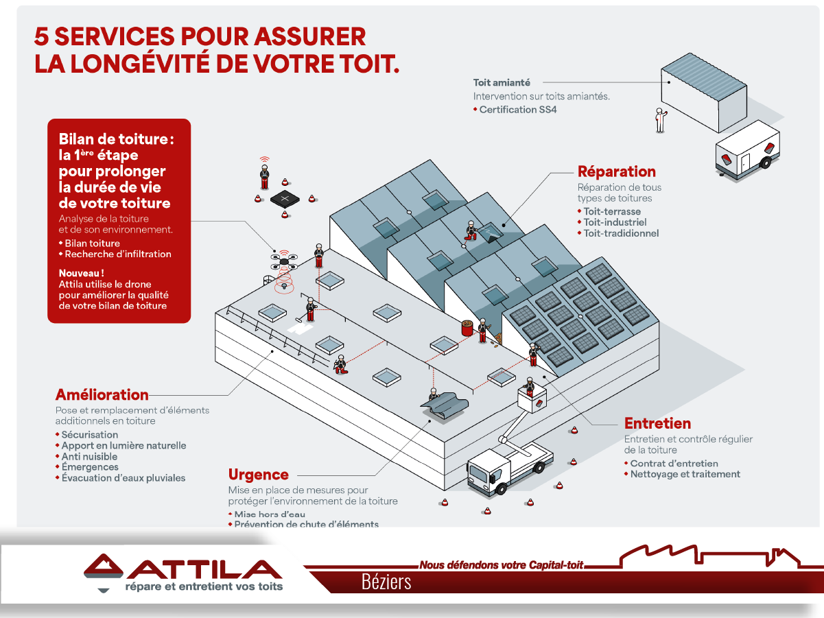 Faites appel à ATTILA Béziers, le 1er réseau national dédié à l’entretien, à la réparation et à la protection de tous types de toits : traditionnels, industriels, terrasses, ou contenant de l’amiante.