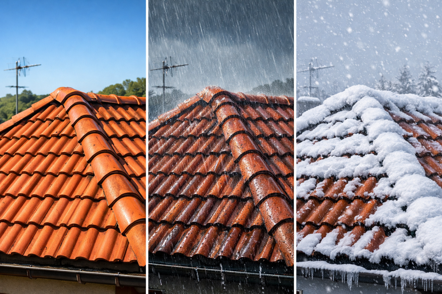 Soleil brûlant, pluie battante ou neige glaciale : votre toit encaisse tout, toute l'année. Sue cette image, on voit clairement ce qu'un toit subit au fil des saisons .. et pourquoi il mérite un peut d'attention !