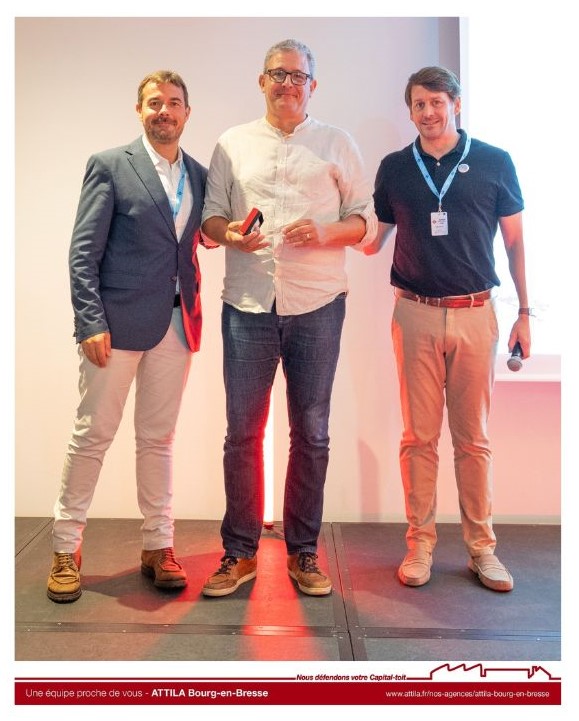 Aussi, à l'agence ATTILA BOURG EN BRESSE nous mettons en place des actions quotidiennes centrées sur la sécurité de nos Techniciens de Toiture ATTILA et de nos clients. Et c’est au nom de toutes les équipes, et avec une grande fierté que Marc BELLOT, gérant franchisé a reçu le prix « sécurité » lors de la dernière convention ATTILA. Cette récompense lui a été remise par Benoit LAHAYE, Président -Fondateur ATTILA et Antony BOULCH, Directeur réseau ATTILA.