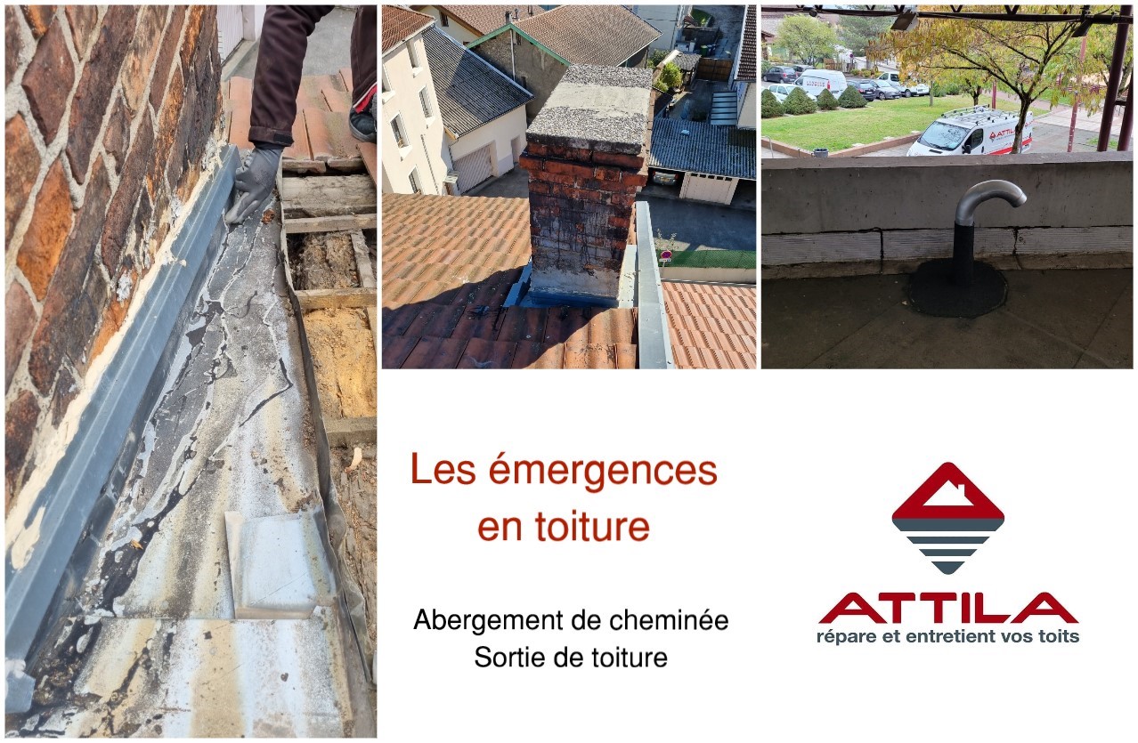 Nous vous conseillons d’entretenir régulièrement vos émergences en toiture. En effet, des défauts d’étanchéité au niveau d’un abergement de cheminée ou d’une sortie de toit peuvent causer des infiltrations d’eau et être à l’origine de sinistres. Ces défauts peuvent provenir du vieillissement des matériaux, d’une soudure cassée, d’une mauvaise mise en œuvre… Parce qu’ils sont susceptibles de provoquer d’éventuelles fuites dans l’ouvrage, il faut pouvoir les réparer rapidement. Nos Techniciens de Toiture ATTILA, et quelle que soit l’action à mener sur ces éléments émergents, travaillent dans les règles de l’art et en toute sécurité.