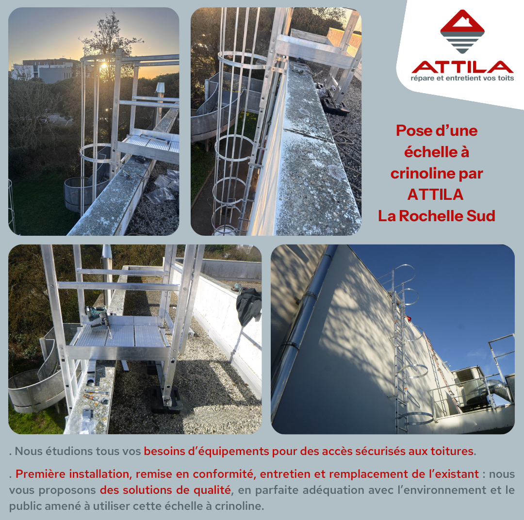 Les équipes de l’agence ATTILA La Rochelle Sud sont récemment intervenues sur ce bâtiment pour installer une échelle à crinoline en façade. Notre objectif dans cette démarche sécuritaire est de permettre un accès sécurisé et permanent à la toiture pour les opérations de maintenance.