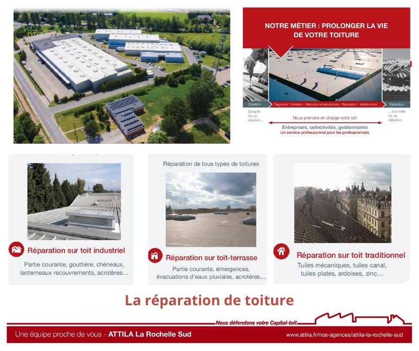 ATTILA est le 1er réseau national spécialisé dans la réparation, l’entretien et la maintenance de tous les types de toits, qu’ils soient industriels, traditionnels, en terrasse ou amiantés.