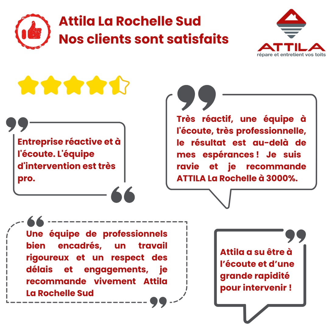 A l’agence ATTILA La Rochelle Sud, nous avons une conviction forte : chaque toiture est unique, et chaque client mérite une écoute et un accompagnement de qualité. Si nos techniciens de toiture s’engagent chaque jour à protéger votre Capital-toit, c’est aussi grâce à vous, à vos retours et à votre confiance.