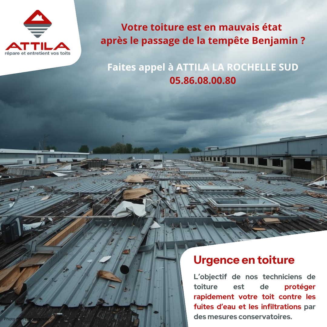 La semaine dernière, la tempête Benjamin a balayé la région, provoquant vents violents et pluies abondantes. De nombreuses toitures ont été fragilisées, que ce soit par des tuiles déplacées, des infiltrations ou des éléments de toiture menaçant de tomber. Face à ce type de situation, il est essentiel d’agir rapidement, mais surtout avec des professionnels formés et équipés. Et localement vous avez ce qu’il faut : l’agence ATTILA LA ROCHELLE SUD.
