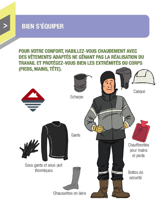 Des vêtements et équipements individuels contre le froid et les intempéries sont à disposition des collaborateurs : Un casque avec doublure isolante, une écharpe tube, des gants isolants et imperméables, des chaufferettes pour mains et pieds, des bottes de sécurité fourrées et antidérapantes, des chaussettes en laine, des sous-gants et sous-pull thermiques.