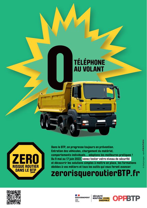 Des affiches « percutantes » sont ainsi disponibles sur le site www.zerorisqueroutierbtp.fr avec des messages tels que : 0 alcool au volant, 0 téléphone au volant, 0 matériel non arrimé, 0 surcharge, 0 excès de vitesse, 0 défaut d’entretien des véhicules, 0 trajet non préparé, 0 manœuvre sans visibilité, 0 trajet sans ceinture et 0 fatigue au volant.