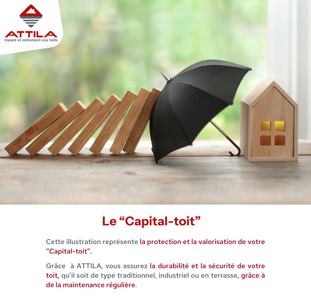 Le « Capital-toit », c’est la capacité de la toiture à protéger les personnes, les biens, l’activité, le confort, la sérénité, la qualité de vie à l’intérieur. C’est une richesse comme l’est le capital-santé ou le capital-confiance ! Comme tout patrimoine immobilier, votre « Capital-toit » se préserve, s’entretient, et se pérennise. En le négligeant vous risquez une dégradation de votre bâtiment et de tout ce qui lui est lié, ou encore des pertes économiques et une dévalorisation de votre patrimoine.