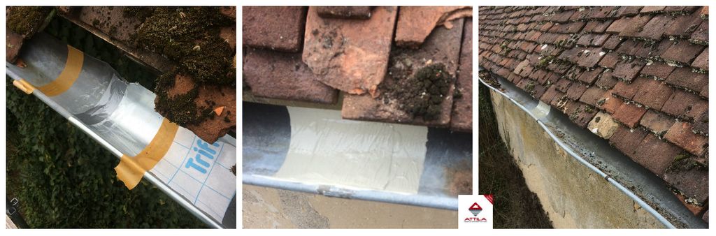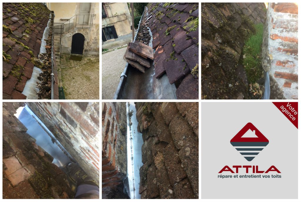 Le nettoyage de tuiles et gouttières recouverts de mousses et emplis de végétaux et autres détritus a été nécessaire et dans des parties du toit difficiles d’accès.