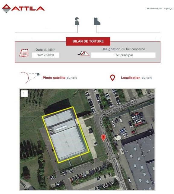 Tout d’abord la vue satellite du toit du bâtiment avec repérage de la zone à contrôler. Il s’agit du toit principal. Ensuite, 20 points sont listés sur un document et le contrôle de chaque partie peut commencer. Les résultats sont classés en vert, jaune et rouge : bon, à surveiller, dégradé. Ces mêmes points sont identifiés sur le schéma du toit avec des numéros.