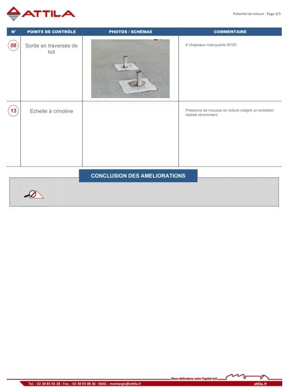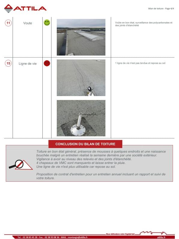 Pour ce client, il apparait par exemple qu’il y a des mousses persistantes malgré un entretien récent réalisé la semaine précédente par une société extérieure, une étanchéité au niveau des joints de couvertine légèrement défectueuse, une naissance bouchée, des joints d’étanchéité sur la voute éclairante à surveiller, une ligne de vie non conforme, de la mousse à proximité de l’échelle à crinoline ou encore des chapeaux de sortie de toiture manquants…