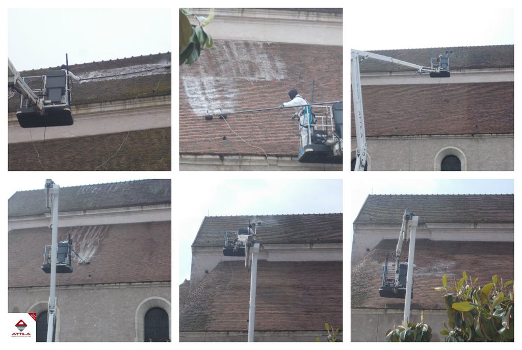 ATTILA n’utilise pas de haute pression pour ne pas endommager les tuiles et ardoises, et travaille avec des produits sans javel ni chlore. Ils sont bio dégradables et agréés par les monuments de France.