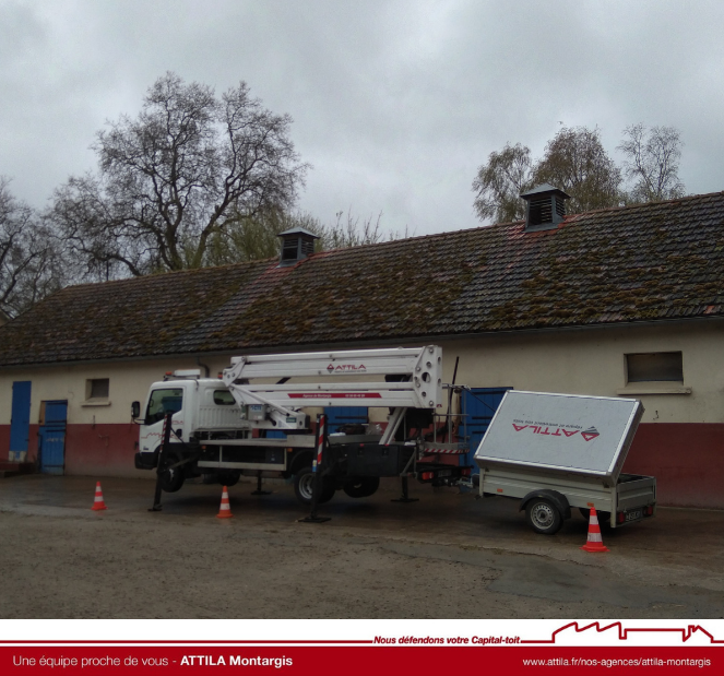 Comme lors de cette intervention réalisée par l’agence ATTILA MONTARGIS, nous utilisons fréquemment notre nacelle qui peut se déployer jusqu’à 24 M. Cela fait toute la différence lors de nos interventions car cela facilite l’accès rapide à tous les types de toitures. La protection contre la chute est assurée dans la nacelle par le port du harnais de sécurité accroché à un point d’ancrage.