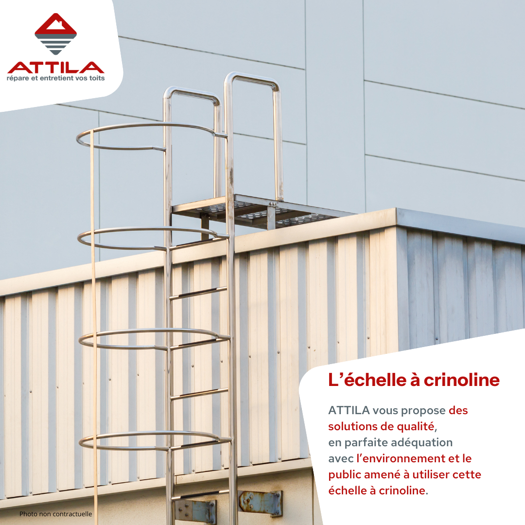 Nos Techniciens de Toiture ATTILA effectuent des actions sur vos échelles à crinoline, comme de l’entretien et des réparations par remplacement standard. Pour garantir l’efficacité optimale d’une échelle à crinoline tout au long de sa durée de vie, nous recommandons un contrôle visuel régulier des fixations et des éléments qui la composent. Nos équipes vous proposent des solutions de qualité pour des accès sécurisés aux toitures de vos bâtiments pour que celles-ci soient en parfaite adéquation avec l’environnement et les personnes amenées à utiliser ces échelles à crinoline.