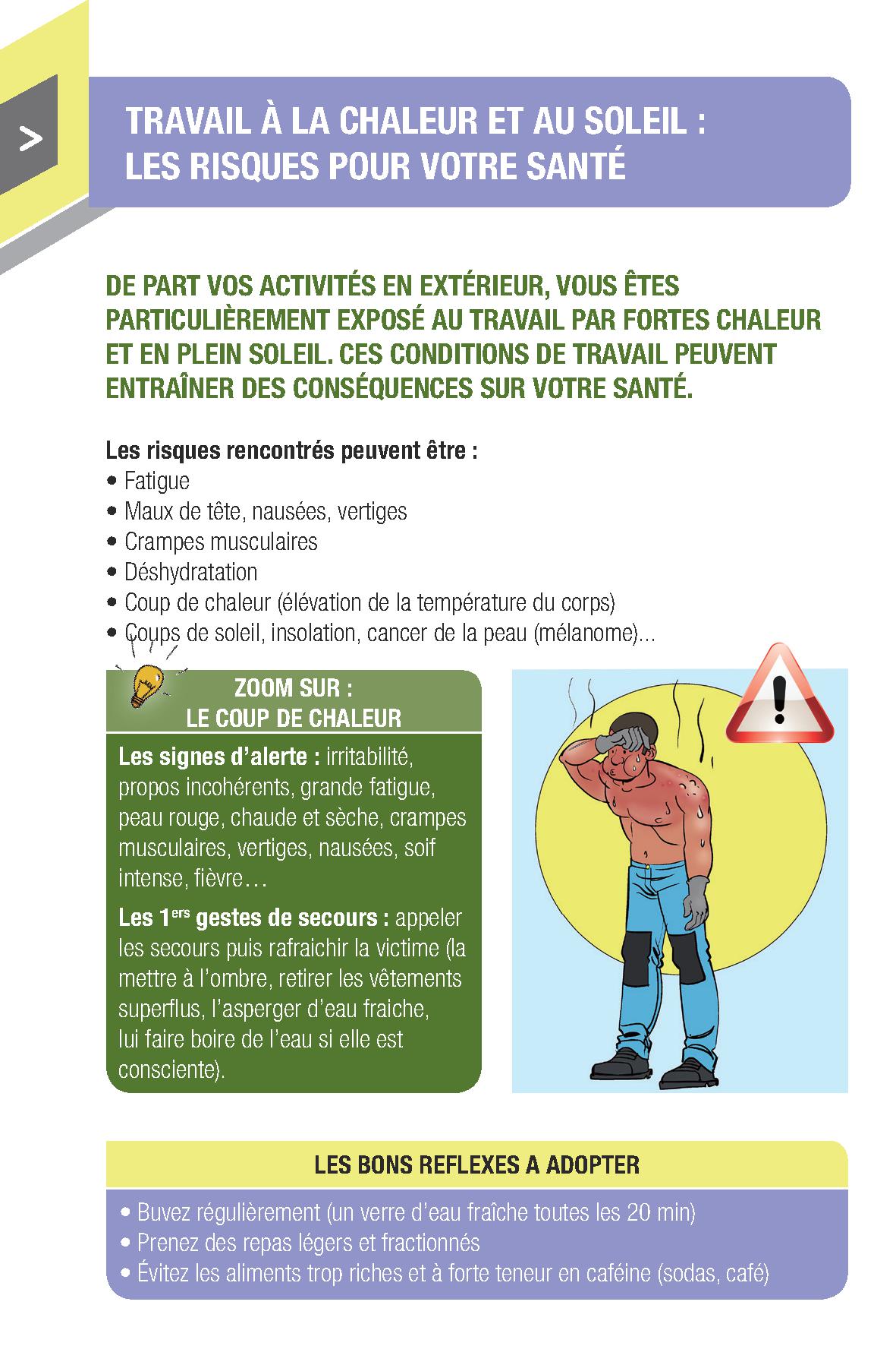 Quels sont les risques lors des interventions ?Un certain nombre de signes d’alertes ne doivent pas être minimisés ou négligés : grande fatigue, peau rouge, chaude et sèche, crampes musculaires, vertiges, maux de tête, nausées, car cela peut entrainer un gros coup de chaleur qui est une élévation de la température du corps, et provoquer des malaises et des chutes. Les coups de soleil, les insolations ou encore les coups de chaleur et la déshydratation sont des risques importants liés à ces conditions climatiques exceptionnelles.