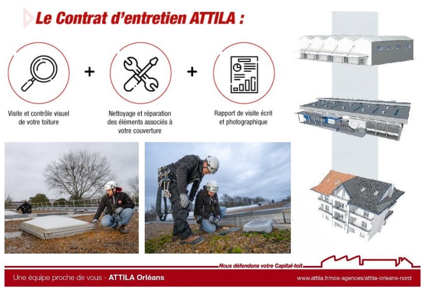 Choisissez la sérénité pour vos bâtiments ou habitations, choisissez le contrat annuel d’entretien de toiture proposé par l’agence ATTILA ORLEANS, spécialisée dans la maintenance de toiture. Il s’agit d’une solution globale pour vos toits qui consiste en un processus de visites régulières sur vos toits durant l’année et qui comprend un contrôle visuel, un nettoyage de la couverture et des éléments associés, un rapport de visite écrit et photographique ainsi que des préconisations visant à prolonger de la durée de vie de la toiture. L’étanchéité, qui est la fonction principale du toit, est alors préservée et renforcée grâce à ces visites.