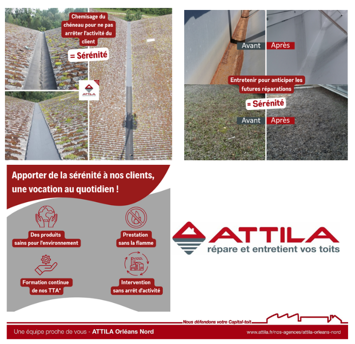 ATTILA est le 1er réseau national spécialisé dans la réparation, l’entretien et la maintenance de tous les types de toits, qu’ils soient industriels, traditionnels, en terrasse ou amiantés.